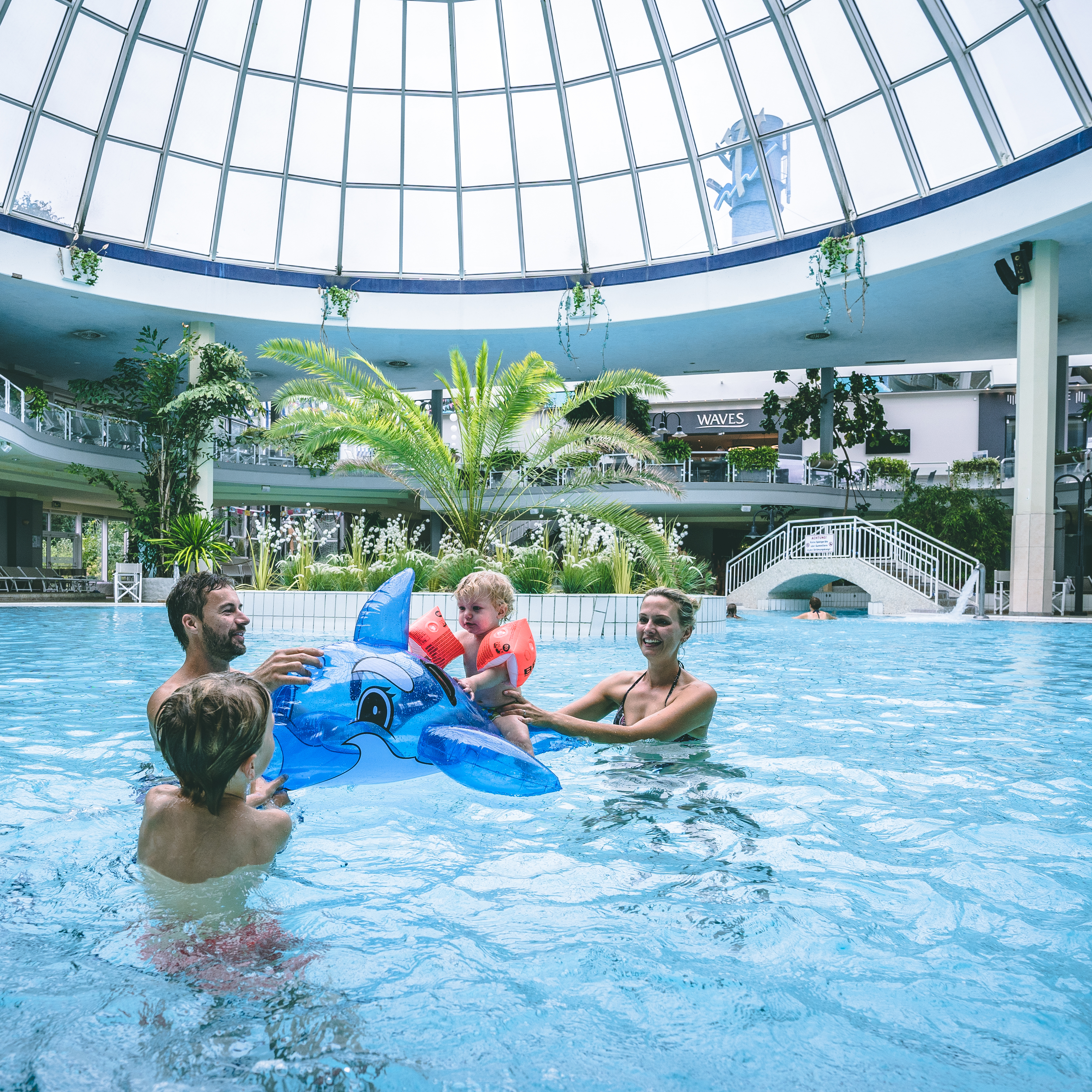 Erlebe 4 Stunden Spaß und Action in der Wasserwelt mit Wildwasserkreisel, Turorutschen und maritimer Kinderwelt. Wen nach dem Wasserspaß der Hunger packt, der findet im Restaurant Waves eine Auswahl an Köstlichkeiten.